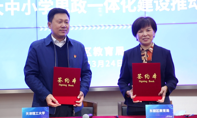 為深入學習貫徹落實習近平總書記關于思想政治工作的重要論述,進一步推進大中小學思政一體化建設,切實提高德育工作的針對性和實效性。3月24日,我校與東麗區教育局簽署大中小學思政一體化共建協議,切實推動實踐育人資源共建共享。天津市教委學生處處長楊明,東麗區教育局黨委書記、局長黃佩玲出席儀式。
