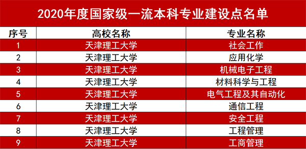 近日,天津市教育委員會高教處轉發教育部辦公廳《關于公布2020年度國家級和省級一流本科專業建設點名單的通知》(教高廳函〔2021〕7號)公布2020年度國家級、省級一流本科專業建設“雙萬計劃”建設點名單。我校社會工作、應用化學、機械電子工程、材料科學與工程、電氣工程及其自動化、通信工程、安全工程、工程管理、工商管理9個專業入選國家級一流本科專業建設點,應用物理學、過程裝備與控制工程、電子科學與技術、制藥工程、工業工程5個專業入選省級一流本科專業建設點。