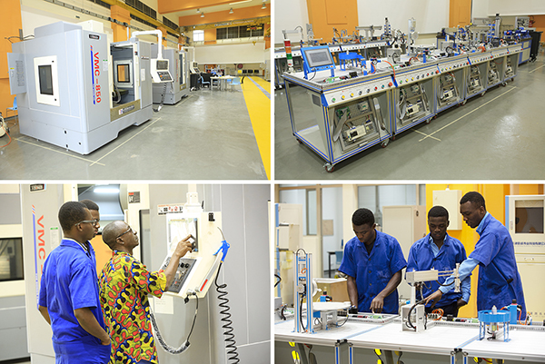 本著“真、實、親、誠”的對非政策,切實解決科特迪瓦國家發展中的實際問題,科特迪瓦魯班工坊的專業設置契合科特迪瓦經濟社會發展戰略,重點建設機械工程和電氣工程及其自動化兩個專業,設立了“先進制造技術”和“電氣自動化”兩個實驗中心,將魯班工坊的實驗內容嵌入到亞穆蘇克羅國立博瓦尼理工學院相關專業的人才培養體系,通過專業基礎性到綜合性的遞進式技術技能訓練,使學生具備高技術素質和技術創新能力。建成的科特迪瓦魯班工坊占地805平方米,建有大型設備車間(實訓場地)1個,實驗室3間、實驗教學和學習教室3間,教研室1間。配備大型設備5個種類11臺套、中小型儀器設備16個種類87臺套,以及實驗臺、投影儀等輔助教學設備。