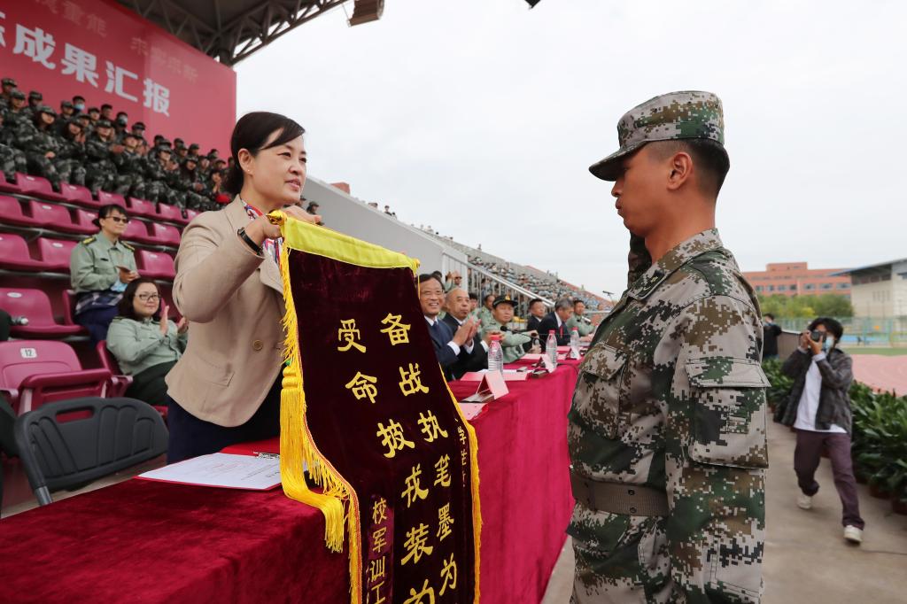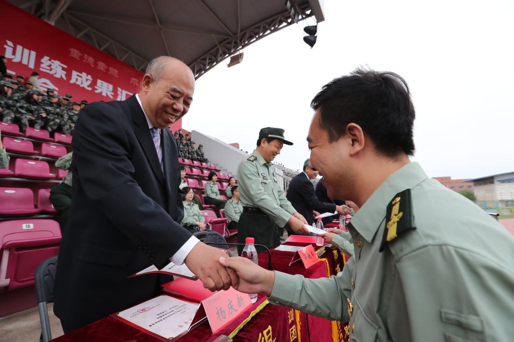 校長楊慶新宣讀《軍訓(xùn)表彰決定》,與會領(lǐng)導(dǎo)為優(yōu)秀學(xué)生、優(yōu)秀教師、優(yōu)秀教官代表和先進(jìn)集體頒獎。武裝部負(fù)責(zé)同志做軍訓(xùn)工作總結(jié)。今年我校有5798名新生參加軍訓(xùn),結(jié)合當(dāng)前疫情防控常態(tài)化工作要求,堅決貫徹習(xí)近平總書記重要指示精神,我校軍訓(xùn)指揮組、政治工作組、教育宣傳組、后勤保障組和安全保障組精誠團(tuán)結(jié)、默契配合、科學(xué)訓(xùn)練,在承訓(xùn)教官和所有參訓(xùn)師生的共同努力下,順利完成預(yù)定的各項軍事技能訓(xùn)練任務(wù),達(dá)成了預(yù)期的目標(biāo)。校黨委副書記郭滇華向在校退役大學(xué)生教官集體贈送錦旗。