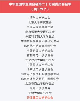 大會選舉產生了179個全國學聯第二十七屆委員會團體委員單位。其中高等學校學生會101個,高等學校和科研教育機構研究生會19個,中等學校學生會48個,國外中國留學生組織11個,我校學生會當選中華全國學生聯合會第二十七屆委員會委員單位,天津共有5所高校學生會入選。
