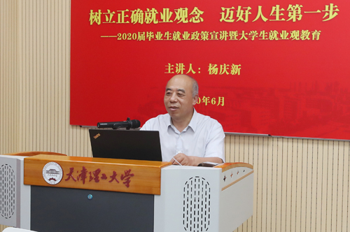 楊慶新在報告會上重點解讀了《天津市關于進一步促進2020年高校畢業(yè)生就業(yè)工作的若干措施》,要求大家要樹立正確就業(yè)觀念,先就業(yè),再擇業(yè),在實踐中磨練自己、提高自己,在未來的職業(yè)發(fā)展中占據(jù)主動;要提前做好求職準備,向優(yōu)秀學兄學姐學習求職技巧,認真撰寫求職簡歷,抓住每一個符合自身條件的就業(yè)機會,盡快落實工作崗位;要增強就業(yè)信心,相信自己在學校里積累的專業(yè)知識、養(yǎng)成的綜合素質(zhì),一定能夠助力自己找到合適的工作;要提高安全意識,保護好個人生命和財產(chǎn)安全。
