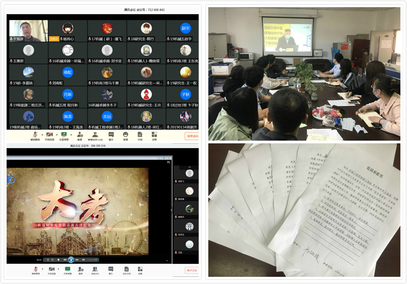 思想引領,堅持黨建領航“不間斷”。學院黨委組織所轄各黨支部學習《中國共產黨章程》、《中國共產黨黨員教育管理工作條例》,觀看大型專題片《大考》,學習鐘南山院士、李蘭娟院士、張文宏教授在教育部學校疫情防控專家報告視頻會上的專題報告,解讀習近平總書記給北京大學援鄂醫療隊全員“90后”黨員回信精神,組織收看“抗疫第一課”主題報告會,認真落實《天津理工大學復課開學疫情防控工作方案》。黨政領導干部帶頭講黨課,充分挖掘戰“疫”精神價值,采取線上課堂講授、自學思考、線上討論交流等方式,引導青年學生成長為有理想、有本領、有擔當的時代新人。組織畢業生黨員在離校前開展專題組織生活會,對標在抗疫斗爭中涌現出的優秀人物和先進事跡,查找自身差距。學院師生黨員結合自身實際,簽署“黨員承諾書”,通過承諾踐諾,立起先進標尺、樹立先鋒形象,切實發揮先鋒模范作用。