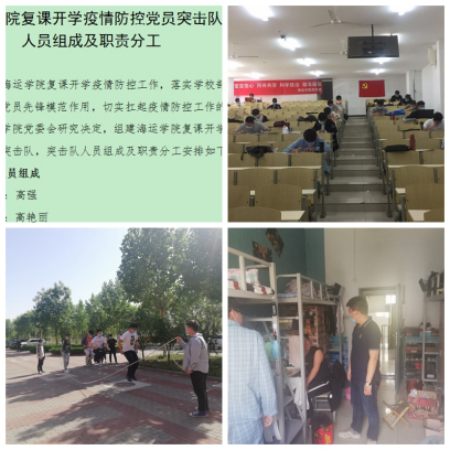 組建海運(yùn)學(xué)院復(fù)課開學(xué)疫情防控黨員突擊隊,明確人員組成及職責(zé)分工,各司其職、落實落細(xì)工作任務(wù);在自習(xí)室、教研室等重點區(qū)域懸掛黨旗,引導(dǎo)黨員堅決做到守土有責(zé)、守土擔(dān)責(zé)、守土盡責(zé);組織學(xué)生開展體育鍛煉,強(qiáng)健體魄提高學(xué)生免疫力,勞逸結(jié)合保證學(xué)生順利完成學(xué)業(yè);黨員學(xué)工教師及時深入學(xué)生宿舍,督促學(xué)生清掃宿舍衛(wèi)生,耐心解答學(xué)校復(fù)課期間疫情防控各項工作安排,加強(qiáng)畢業(yè)班就業(yè)心理疏導(dǎo)。