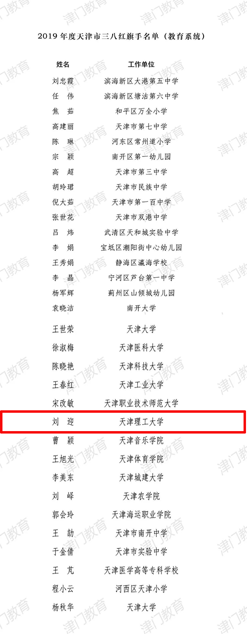 近日,市教育兩委公布被市婦聯授予“天津市三八紅旗手”榮譽稱號和“天津市三八紅旗集體”榮譽稱號的個人和集體名單,我校團委書記劉迎同志榮獲“天津市三八紅旗手”榮譽稱號。市教育兩委號召全體師生、干部職工以受到表彰的優秀女性和集體為榜樣,愛黨愛國、忠于人民,敬業勤勉、追求卓越,挺身而出、英勇奮斗,以奮發有為的進取精神和真抓實干的實際行動,只爭朝夕、不負韶華,在奪取疫情防控和經濟社會發展雙勝利中無私奉獻,在決戰決勝全面建成高質量小康社會中匯聚天津教育力量。