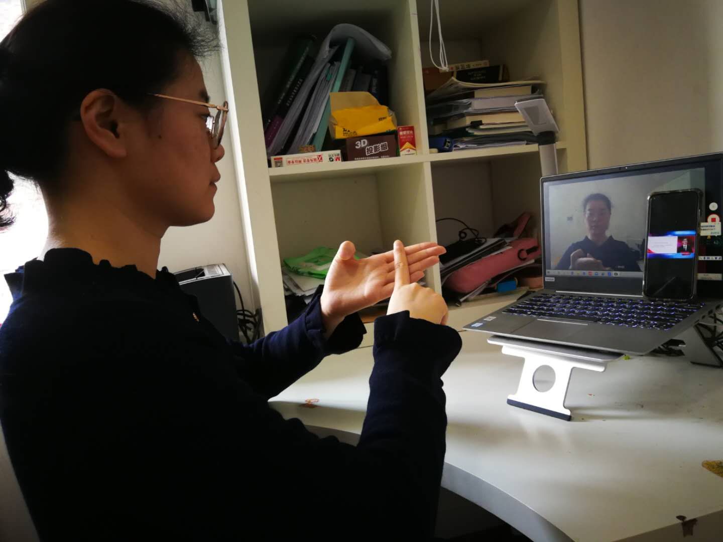 天津理工大學的教師、聽障學生開展了多次的研討和試譯。馬克思主義學院楊麗英教授解析新名詞新概念的含義,聾人工學院思政課教師王曉鷗、吳楊,國家通用手語培訓教師李子剛以及聽障學生黨員梁一帆共同商討,不斷嘗試,確定了含義準確的手勢。為克服四位專家教師的授課語速和手語翻譯速度的差異,保證同步翻譯,聾人工學院組織李子剛、吳楊、王曉鷗三位骨干翻譯老師進行突擊手語培訓和試譯練習。