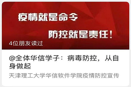 機械工程學院師生制作“武漢加油,有困難我們一起扛”主題H5,在宣傳防疫知識的同時向學子發出“抗疫情 傳能量 天理人 在行動”的倡議。