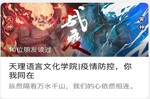面對當前疫情防控特殊時期,學工隊伍積極探索網絡思政教育新思路新方法,堅持做好宣傳教育工作,引導學生理性關注疫情,不傳謠、不信謠,保持健康、穩定的身心狀態,堅定戰勝疫情的信心和決心。學工部微信公眾號“天理學工”每天發布師生原創推文,轉載官方權威信息,全力做好學生科學防疫知識普及、思政引導、心理疏導等工作。發布“同力協契共克時艱——致學校全體學生的一封信”“錘煉政治品格 踐行使命擔當——致學校全體學生黨員的倡議書”“致全體天理輔導員的一封信”,鼓勵廣大學生和輔導員隊伍堅定必勝信心,科學面對疫情,弘揚正能量;通過“少年易老學難成,一寸光陰不可輕”“這個假期,天理人的抗‘疫’行動”“武漢,我們春暖花開見”“開卷有益小編薦讀”“運動有益輔導員帶你一起居家健身”等輔導員原創微文、手繪作品、運動視頻等,引導學生養精蓄銳,合理規劃假期生活;發出“藝術戰‘疫’”主題作品集結號,引領天理學子心手相牽,合力戰“疫”!