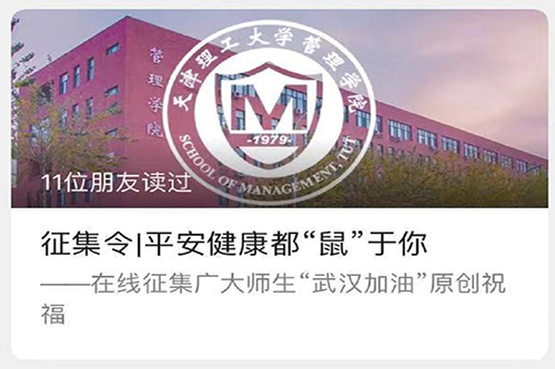 管理學院在線征集師生“武漢加油”原創祝福,號召全體師生為戰勝疫情貢獻力量。