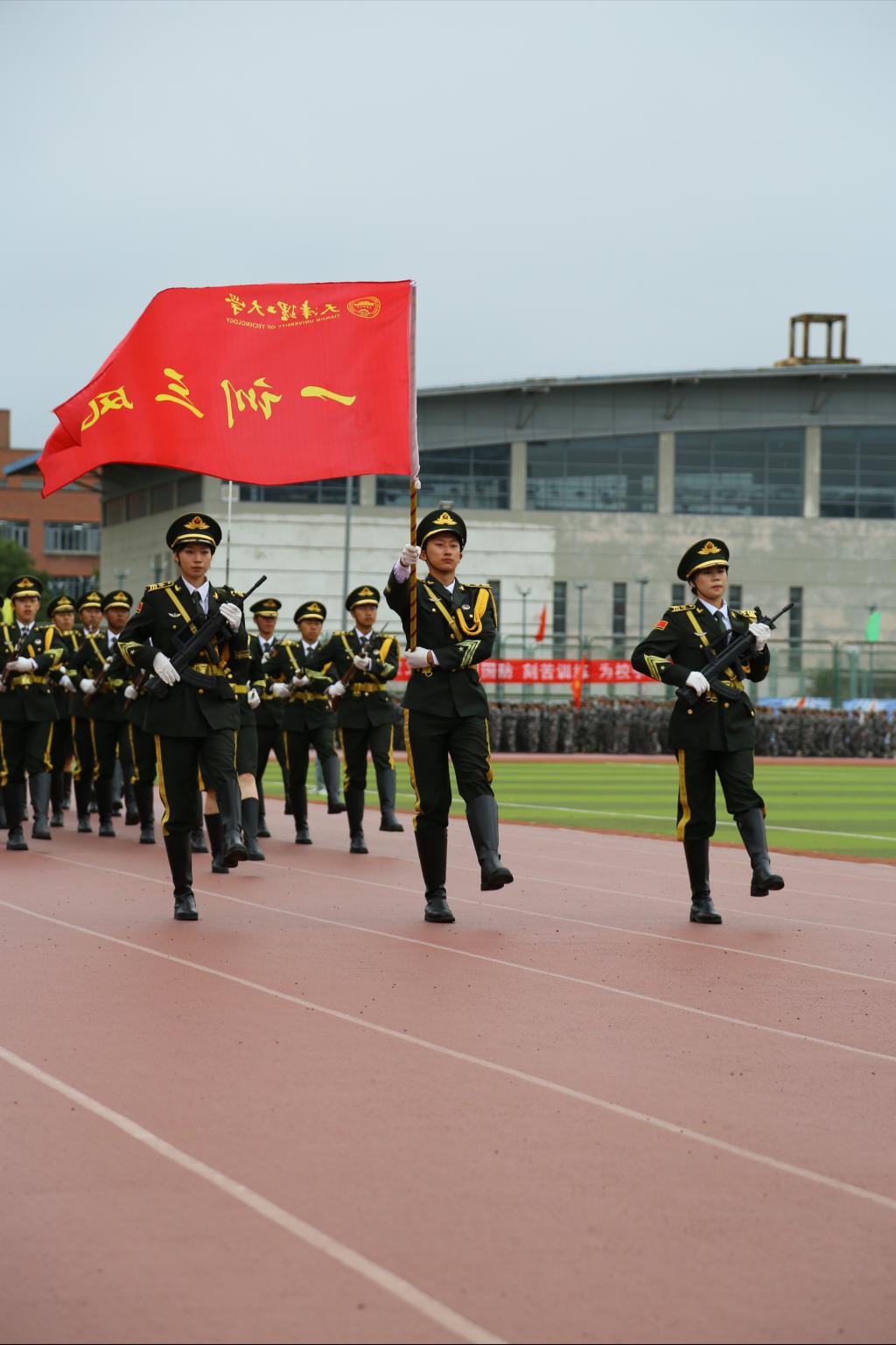 在分列式表演環節,由“一訓三風”分列式和各學院組成的19支受閱方隊以颯爽的英姿、嘹亮的口號、整齊的步伐依次經過主席臺,接受與會領導的檢閱。