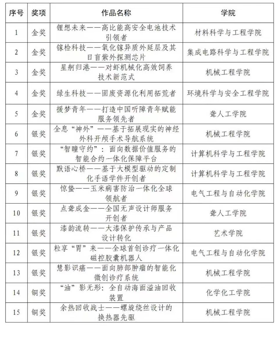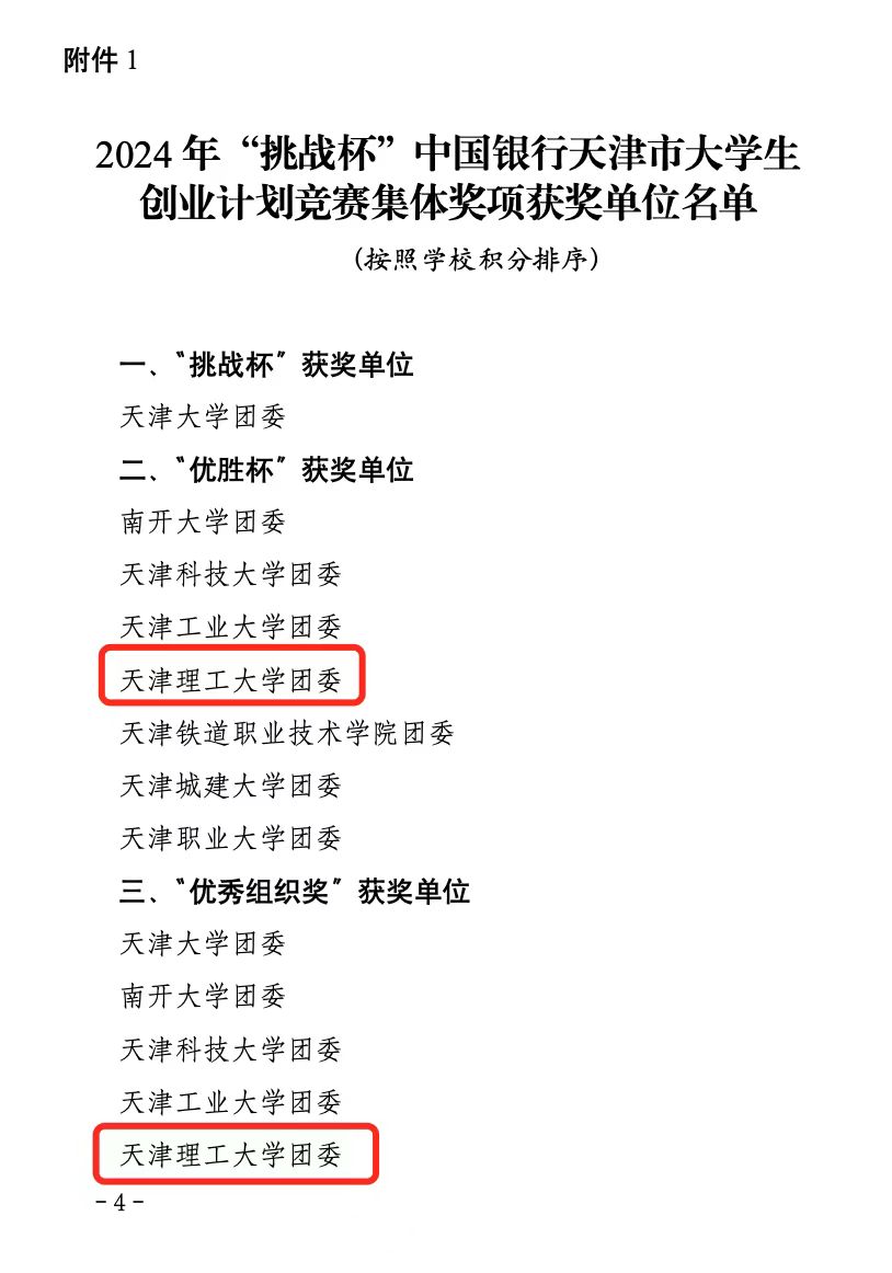 近日,由團市委、市委教育工委、市教委、市科技局、市人社局、市科協、市學聯共同舉辦的2024年“挑戰杯”中國銀行天津市大學生創業計劃競賽獲獎名單公布。我校推薦的15項作品均獲得獎項,其中金獎5項、銀獎8項、銅獎2項,創歷史新高。5項金獎作品全部順利被推薦參加國賽,其中兩項金獎項目晉級決賽終評。我校榮獲“優勝杯”和“優秀組織獎”。