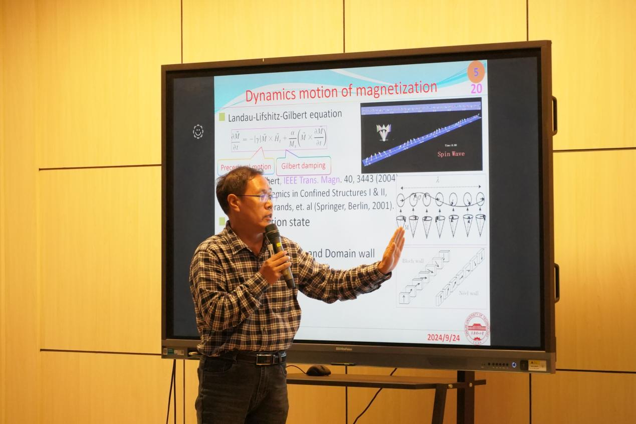 李再東以“慣性狀態(tài)下的磁化強(qiáng)度動(dòng)力學(xué)”為題,指出慣性效應(yīng)可以形成磁化螺旋結(jié)構(gòu),并且可以通過慣性矩的驅(qū)動(dòng)在超快磁學(xué)中獲得更高的領(lǐng)域壁速度,相應(yīng)的驅(qū)動(dòng)場(chǎng)更小。他結(jié)合自身科研經(jīng)歷鼓勵(lì)青年教師要提高自身發(fā)現(xiàn)問題,解決問題的能力,扎實(shí)做好科研工作。