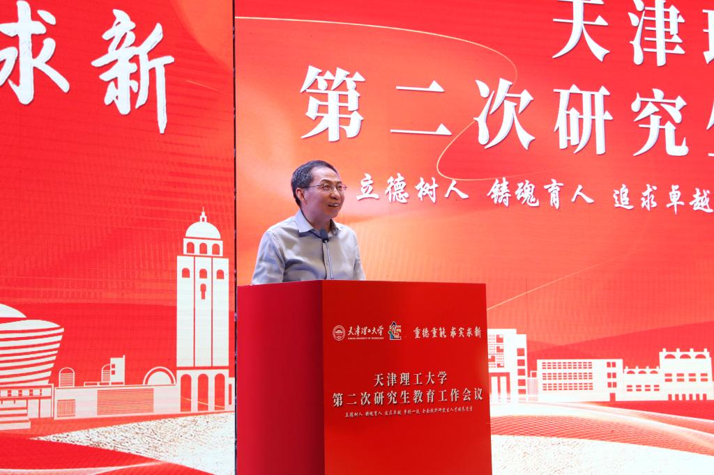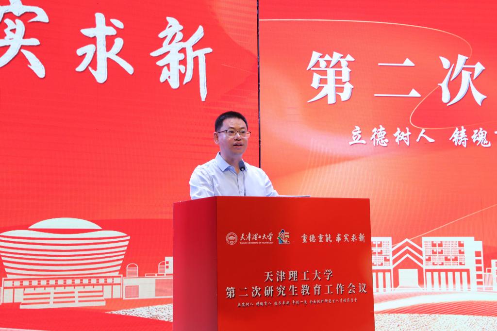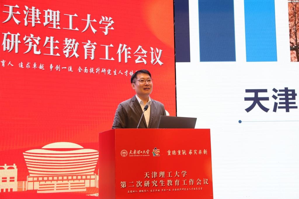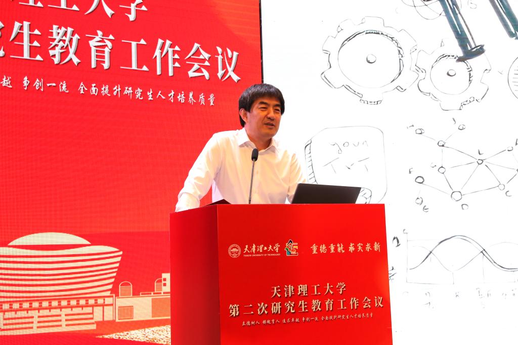 陳勝勇作了題為“天津理工大學(xué)全面提升研究生人才培養(yǎng)質(zhì)量”的工作報告。他總結(jié)了2020年以來我校研究生教育在人才培養(yǎng)、科學(xué)研究和社會服務(wù)等方面取得的重要成績,分析了國家研究生教育的新形勢和新要求,部署了新發(fā)展階段研究生教育工作的重點任務(wù)。他強調(diào),學(xué)校研究生教育發(fā)展要落實立德樹人根本任務(wù),堅持不懈用習(xí)近平新時代中國特色社會主義思想鑄魂育人,全面探索構(gòu)建強基筑峰學(xué)科創(chuàng)新發(fā)展、引賢育才師資隊伍建設(shè)、卓越工程師學(xué)院建設(shè)、頂天立地產(chǎn)教協(xié)同育人、人工智能賦能人才培養(yǎng)、開放互鑒國際合作、本研貫通本碩博銜接培養(yǎng)、雙螺旋校企合作人才培養(yǎng)等重點領(lǐng)域。他指出,要以本次會議為契機,強化責(zé)任,凝聚合力,全面開創(chuàng)學(xué)校研究生教育工作新局面。協(xié)同創(chuàng)新、形成合力,秉承“重德重能 求實求新”的校訓(xùn),踐行“愛國奉獻、求真務(wù)實、艱苦奮斗、開放包容、創(chuàng)新進取”的天理精神,為奮力開創(chuàng)高水平教學(xué)研究型理工大學(xué)建設(shè)的新局面而努力奮斗。