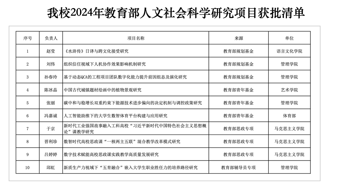 9月中旬,教育部社會科學司公布了2024年度教育部人文社會科學研究項目立項結果,我校有10個項目獲批立項(其中規劃基金3項、青年基金3項、思政專項3項、輔導員研究專項1項),在全市高校排名第四,市屬高校排名第二,位居市屬理工類高校首位。