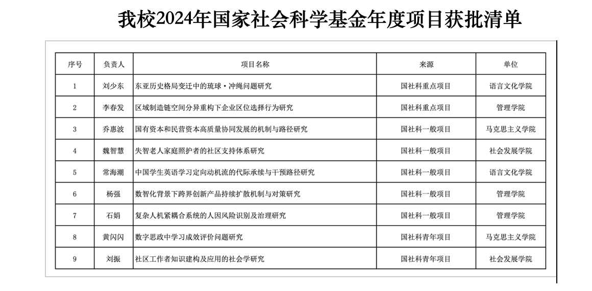近日,全國哲學社會科學工作辦公室公示了2024年國家社會科學基金年度項目立項結果,我校有9個項目獲批立項(其中重點項目2項、一般項目5項、青年項目2項),在全市高校排名第五,市屬高校排名第三,位居市屬理工類高校首位。