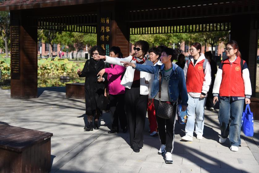 志愿者們引領盛陽園老年居民漫步明理湖畔,穿梭于體育館、圖書館之間,在鐘樓前駐足,靜靜品味校園風光。面對天理的秀美風光,現場老人們不禁回憶起自己的青春歲月,沉浸在對往昔時光的懷念之中,流露出對重返校園、重歸“青春”的激動與喜悅之情。