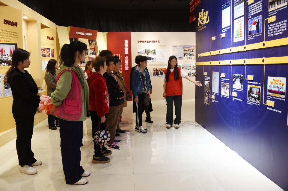 志愿者們帶領老年居民步入校史展,詳細了解學校的發展歷史以及畢業生的杰出成就。恰逢建校四十五周年之際,老年居民們紛紛送上對學校的誠摯祝福。老年居民對學校的歷史有了更為深入的認知,老人們聲情并茂地講述著年輕時的點點滴滴,現場歡聲笑語,氣氛熱烈。