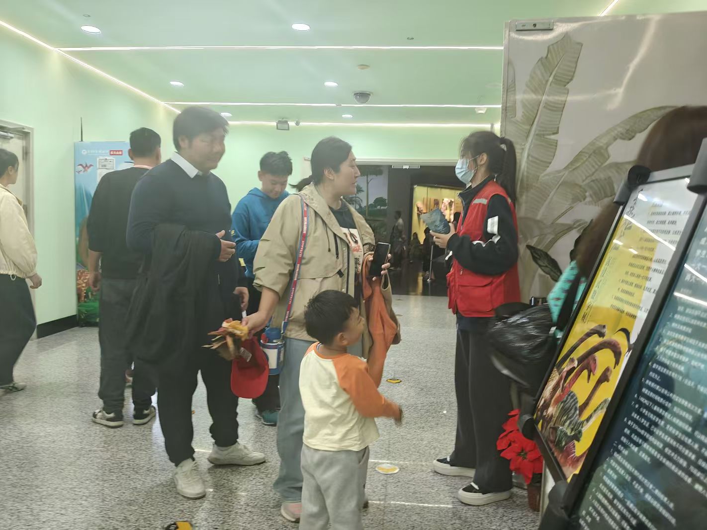 志愿者們在各自的崗位上有序開展各項服務工作。在數字展廳,志愿者們對博物館的展品進行細致的講解,耐心解答游客的問題,幫助他們完成展館預約,為游客帶來了全方位的游覽體驗。部分志愿者在劇本游攤位,熱情地協助游客進行蓋章紀念,維護現場秩序。