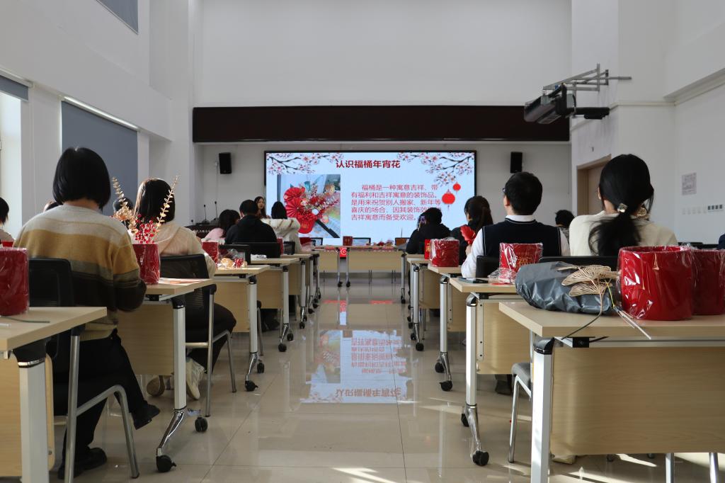活動現場,教師們相互交流技巧,構思造型,根據自身喜好進行裁剪、搭配,為福桶掛上中國元素的配飾,再插上小掛件進行點綴。在裝飾高低錯落的點綴其間,一盆盆金燦燦、紅彤彤的迎新福桶展現在大家的面前。