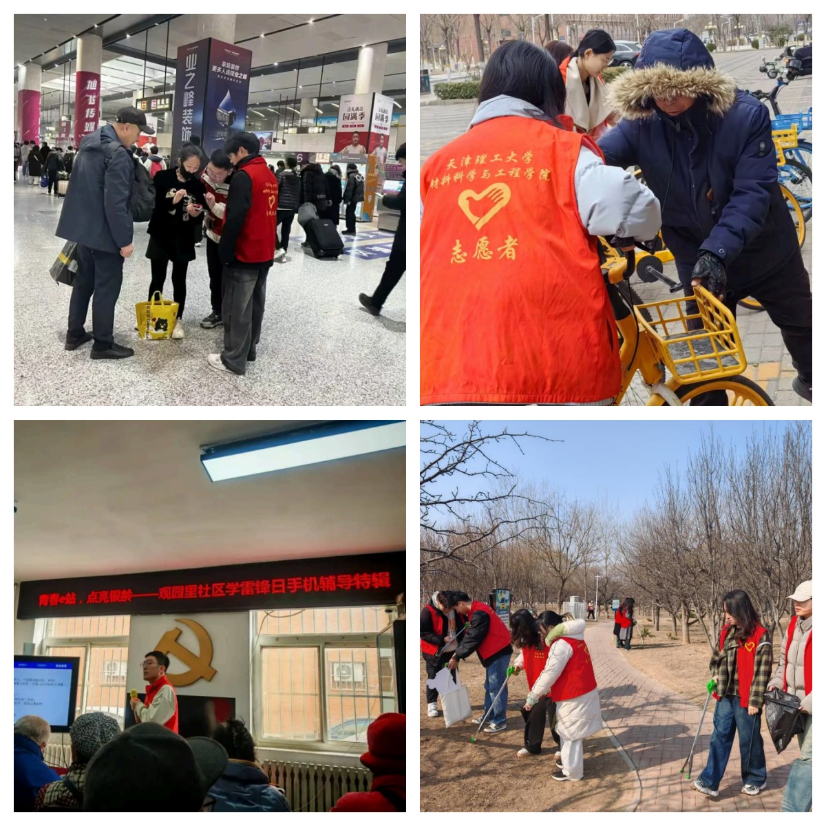 材料科學與工程學院青年志愿者分別前往天津西站地鐵站、觀園公寓、水上公園以及校園活動區進行志愿服務活動。在天津西站地鐵站,志愿者們貼心地為有需要的乘客進行路線指引,同時維護地鐵站正常秩序。在觀園公寓,志愿者們開展手機課堂服務,為老年人們講述如何正確安全地使用AI軟件。在水上公園,志愿者們認真地維護游園秩序、愛園護綠、垃圾分類、擦拭座椅,讓雷鋒精神在篤行中傳承榜樣力量。在校園活動區,志愿者身披小馬甲,手持垃圾袋維護校園整潔、打掃校園衛生,將違停的共享單車回歸原位,為維護校園整潔貢獻力量。
