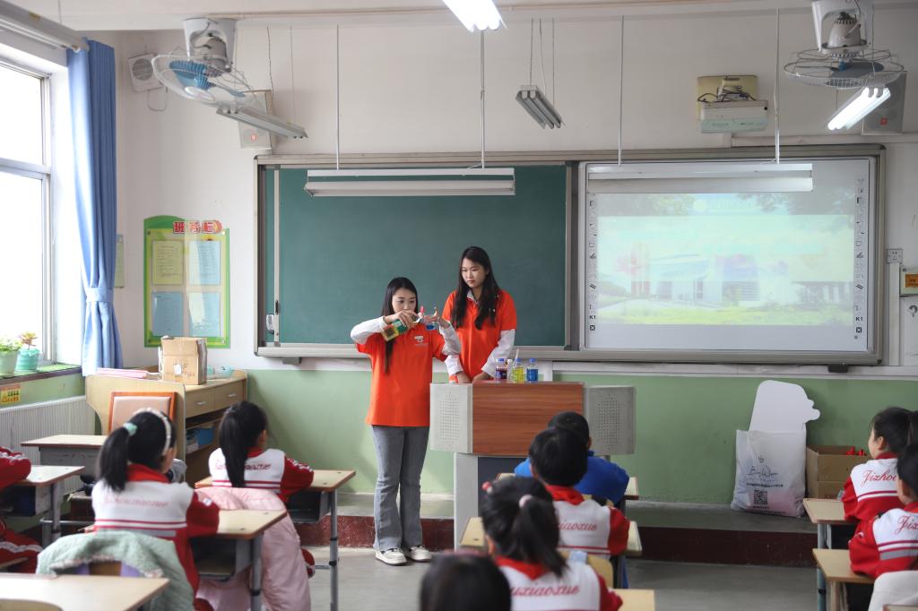 在科普實踐環節,志愿者們通過“科學探秘三部曲”教學模式,開展“變色水壺”“泡沫反應”等多個趣味實驗。40余名小學生認真觀察了酸堿反應、溶液變色等科學現象。在“軍旅育苗”環節中,退役大學生許亞倩以“我的迷彩青春”為主題,通過軍營故事分享、內務規范教學等互動形式,幫助孩子們樹立紀律意識與家國情懷。這種“扶智+扶志”的育人模式,深入落實教育系統“學雷鋒做志愿服務改革建新功”主題實踐活動?;顒幼詈螅瑢W院教師為東太河中心小學捐贈圖書。