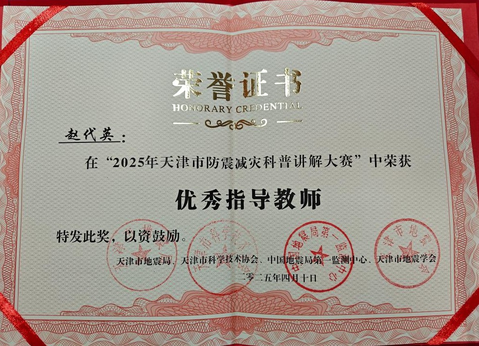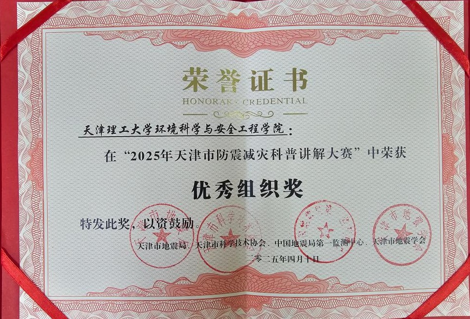 近日,2025年天津市防震減災科普講解大賽暨第九屆全國防震減災科普講解大賽選拔賽結果公布。環境科學與安全工程學院獲優秀組織獎、作品《地震次生災害:危化品的泄漏與應對》獲優秀獎、教師趙代英榮獲優秀指導教師。