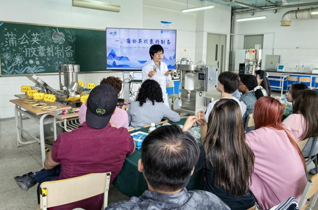 在制藥工程系教學(xué)實(shí)驗(yàn)室內(nèi),專業(yè)課教師李彩文以常見(jiàn)的蒲公英、艾草、陳皮等中草藥為切入點(diǎn),詳細(xì)介紹了它們的性味、功效、炮制方法等,并生動(dòng)講解了藥物的提取、分離及制備的科普知識(shí)。留學(xué)生們親手體驗(yàn)蒲公英膠囊的制備,從稱量原料到填充封裝,直觀感受中醫(yī)藥與現(xiàn)代制藥技術(shù)的完美融合。