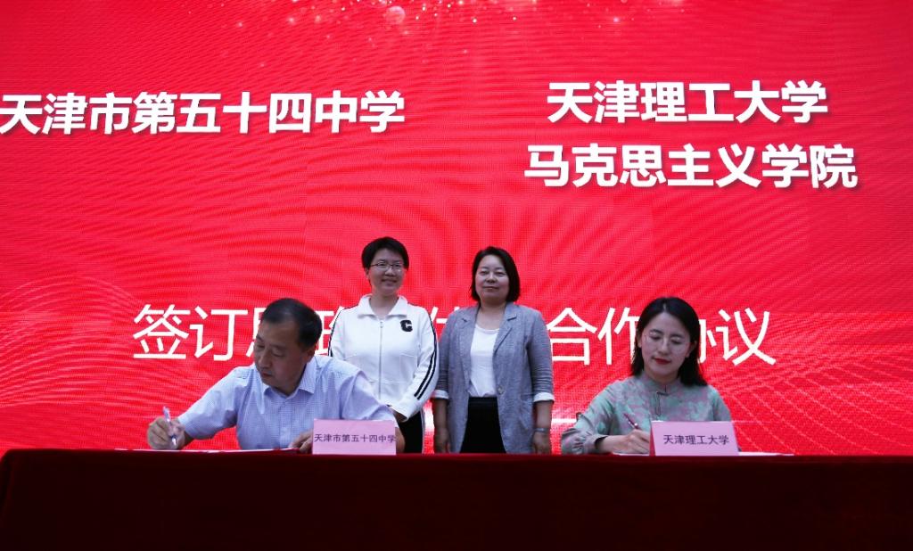 在教聯(lián)體簽約儀式上,學(xué)院與天津市第五十四中學(xué)、天津市第四十五中學(xué)華英學(xué)校、天津市伯苓高級中學(xué)分別簽訂大中小學(xué)思想政治教育一體化合作協(xié)議。