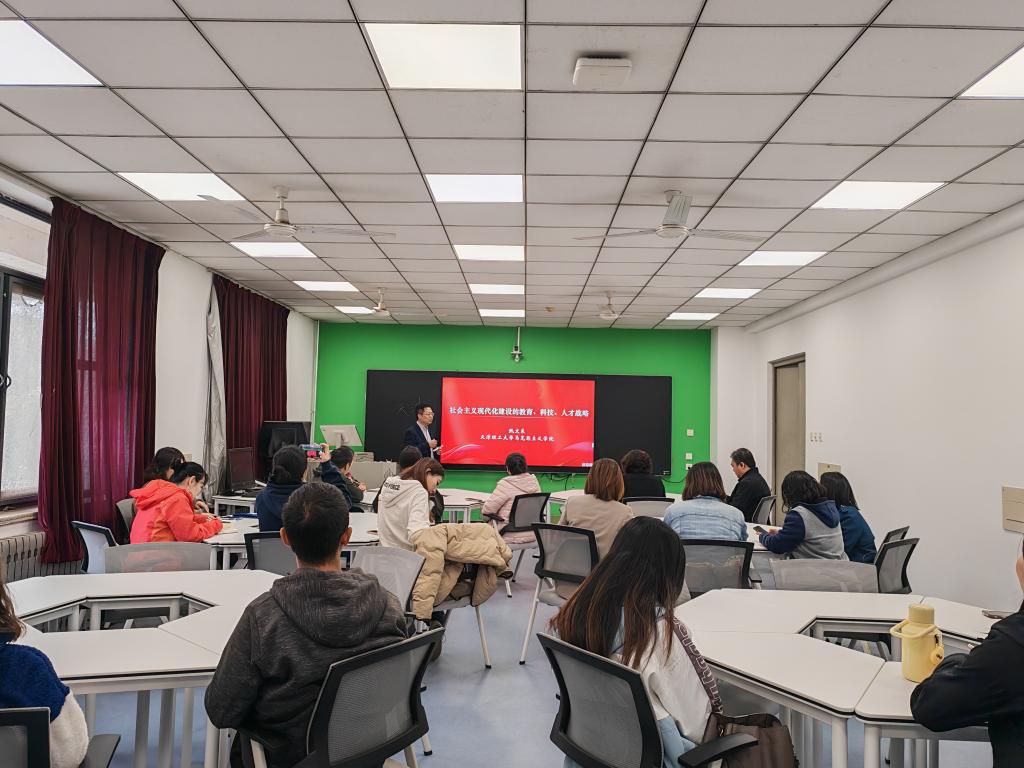 活動伊始,馬克思主義學院甄文東副教授為全體人員作理論講座。甄文東深入淺出地闡述了教育、科技、人才在社會主義現代化建設中的重要地位和相互關系。