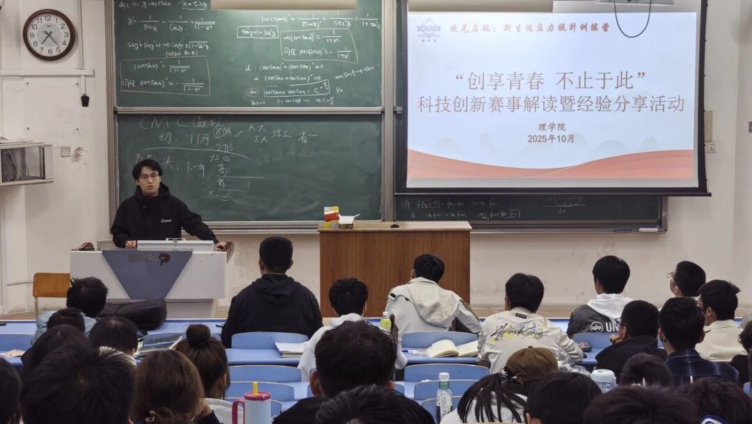 近日,理學院開展科技創新賽事解讀暨經驗分享活動。本次活動由2022級應用物理學專業學生馬富祥、2022級數學與應用數學專業學生徐楊智和2023級數學與應用數學專業學生趙嘉璇擔任主講嘉賓。