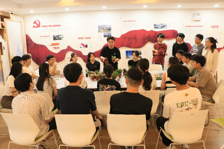 天津農學院輔導員、天津市十佳輔導員劉柳以《植物與新中國史》為題,講授了微黨課。他以國徽上的小麥、東方神藥青蒿素、航天助力“農業芯片”等故事,生動再現了老一輩革命家、新時代科技工作者滿懷信心、迎難而上的奮斗場景,激勵廣大師生要堅定理想信念、矢志拼搏奮斗。接著,師生分組開展紅色微景觀設計大賽,以植物微景觀的藝術形式,展示了歷史上的重大事件。在園林專業同學的講解下,師生很快掌握了植物微景觀制作步驟及日常養護技巧。