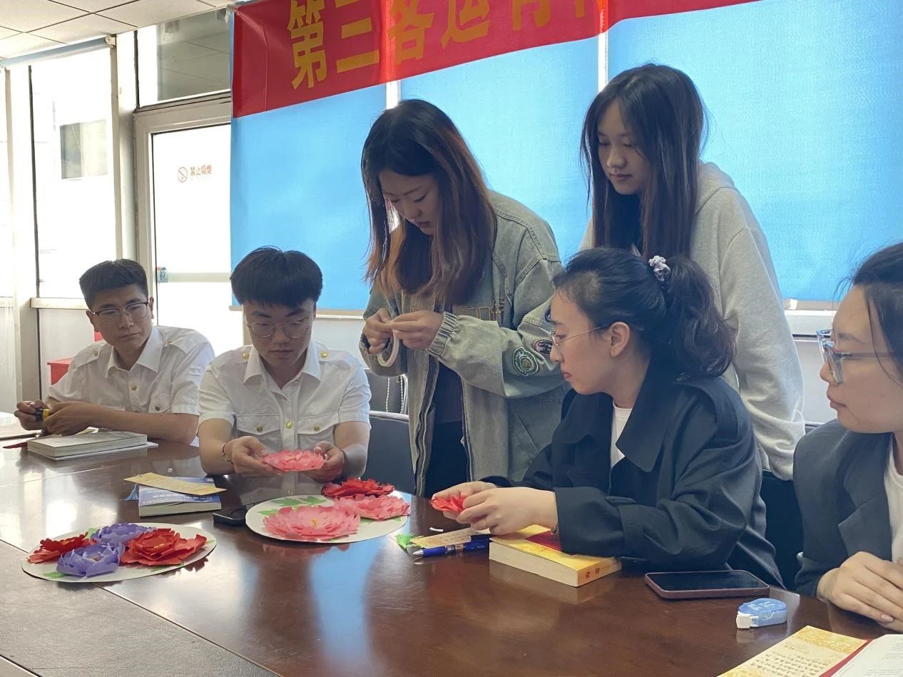師生代表與公交職工互贈書簽,表達最美好的祝福,并一起制作了牡丹花立體扇面。