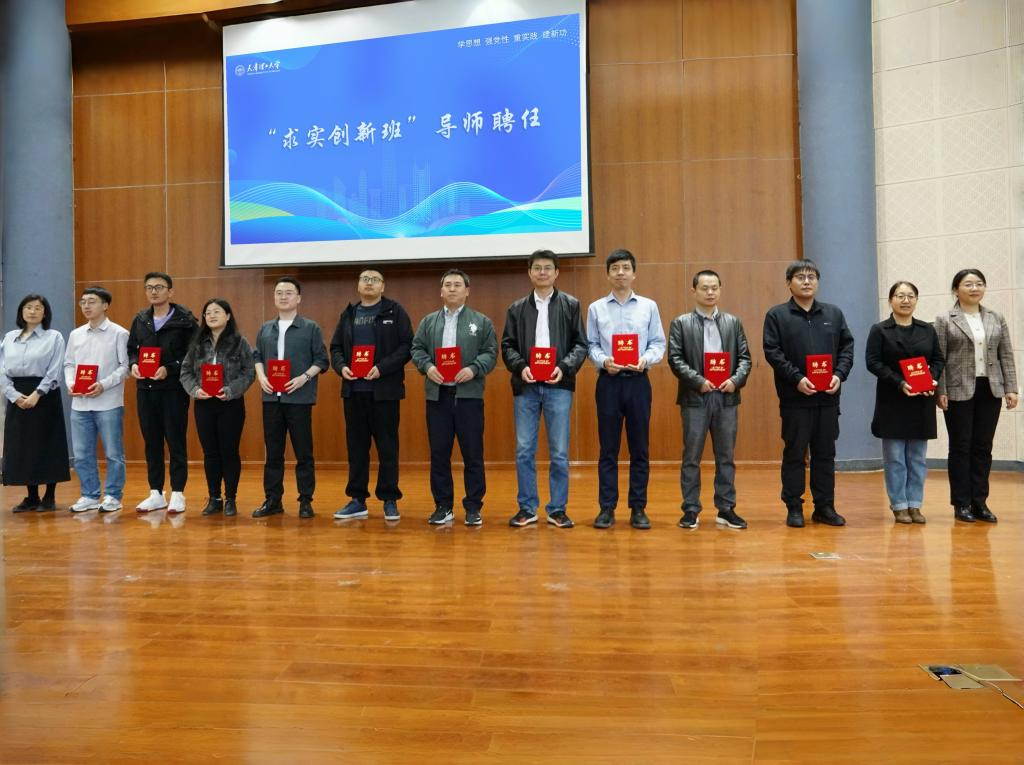 學(xué)院黨委主要負(fù)責(zé)人為“求實(shí)創(chuàng)新班”授旗,教務(wù)處、創(chuàng)新創(chuàng)業(yè)學(xué)院相關(guān)負(fù)責(zé)人以及學(xué)院相關(guān)負(fù)責(zé)人為“求實(shí)創(chuàng)新班”導(dǎo)師頒發(fā)聘書。