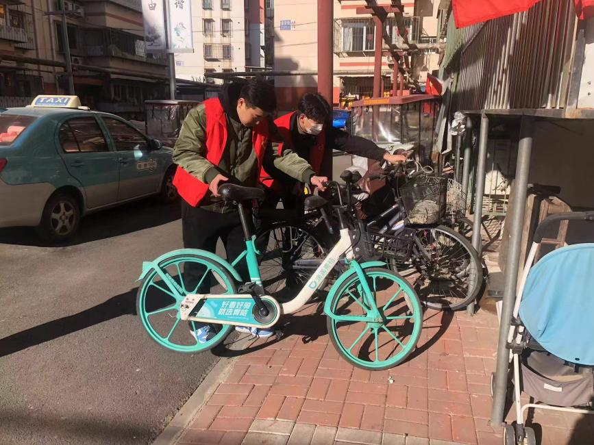 3月1日,學院青年志愿者來到佳安里社區,幫助擺放共享單車。在社區便民義診服務點位,志愿者們輔助專業醫生為社區居民進行醫療診斷。