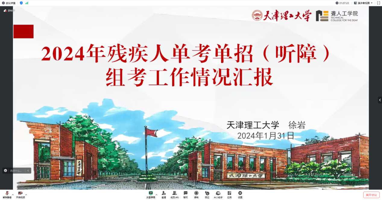 近日,受中國殘聯教育就業部委托,中國高等教育學會特殊教育研究分會通過線上方式召開2024年普通高校殘疾人單考單招工作研討會。中國殘聯教育就業部、教育部高校學生司、基礎教育司、教育部考試院以及中國高等教育學會特殊教育研究分會有關負責同志出席會議,并就2024年殘疾人單考單招工作的規范性、公正性、安全性等作出具體指導和要求。我校聾人工學院相關負責同志就我校2024年殘疾人單考單招組考準備工作進行了匯報發言。