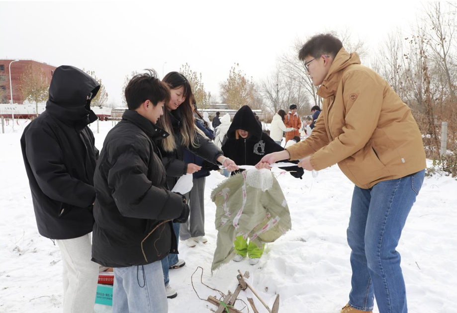 在低溫寒潮前夕,學院師生到“明理農場”開展植保活動,為田里的植物搭建御寒“小房子”,保護植被成長。