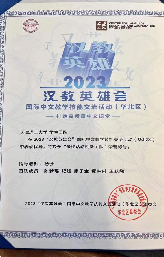 近日,由全國漢語國際教育專業學位研究生教育指導委員會、教育部中外語言交流合作中心主辦,北京外國語大學、外語教學與研究出版社承辦的2023年“漢教英雄會”國際中文教學技能線下交流活動(華北區)在北京成功舉辦。語言文化學院國際中文教育碩士生團隊獲得“最佳活動創新團隊”榮譽稱號,充分展現了天理學子的創新精神和卓越風采。