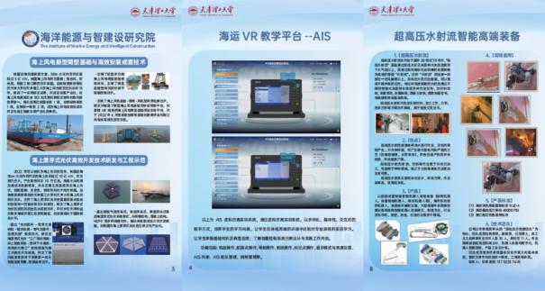 學校組織涉海學科的項目參加了高校科研單位第五展區的展覽,展板內容包括:學校介紹、海洋能源與智能建設研究院介紹、海運VR教學平臺、海上平臺數字孿生應用、船舶智能制造平臺、廠內精確定位系統、超高壓水射流智能高端裝備等,學校還印制了涉海研究的宣傳資料。