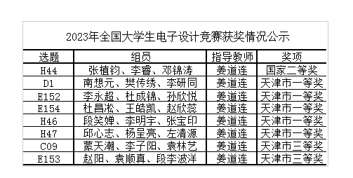 近日,2023年全國大學生電子設計競賽獲獎名單公示,集成電路科學與工程學院喜獲佳績,斬獲全國二等獎1項,天津市一等獎5項,天津市三等獎2項。