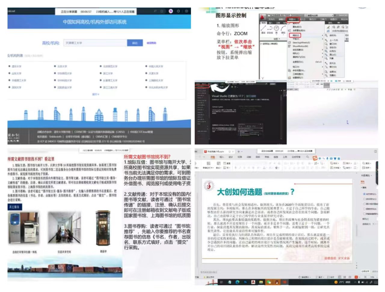 朋輩講師劉雅麗為大家帶來了有關網課的學習和選課流程,分享了自己的親身經歷,詳細介紹了選課過程。朋輩講師王呈松、高糈菠、李妍演示了有關實用軟件的應用,包括Solidworks\CAD\VS等。朋輩講師陳祥瑞向同學們介紹了知網的使用方法并現場演示論文查找方式。朋輩講師惠錦越以科創比賽為題講解了不同比賽的分類及方向,鼓勵大家積極參加科創比賽。