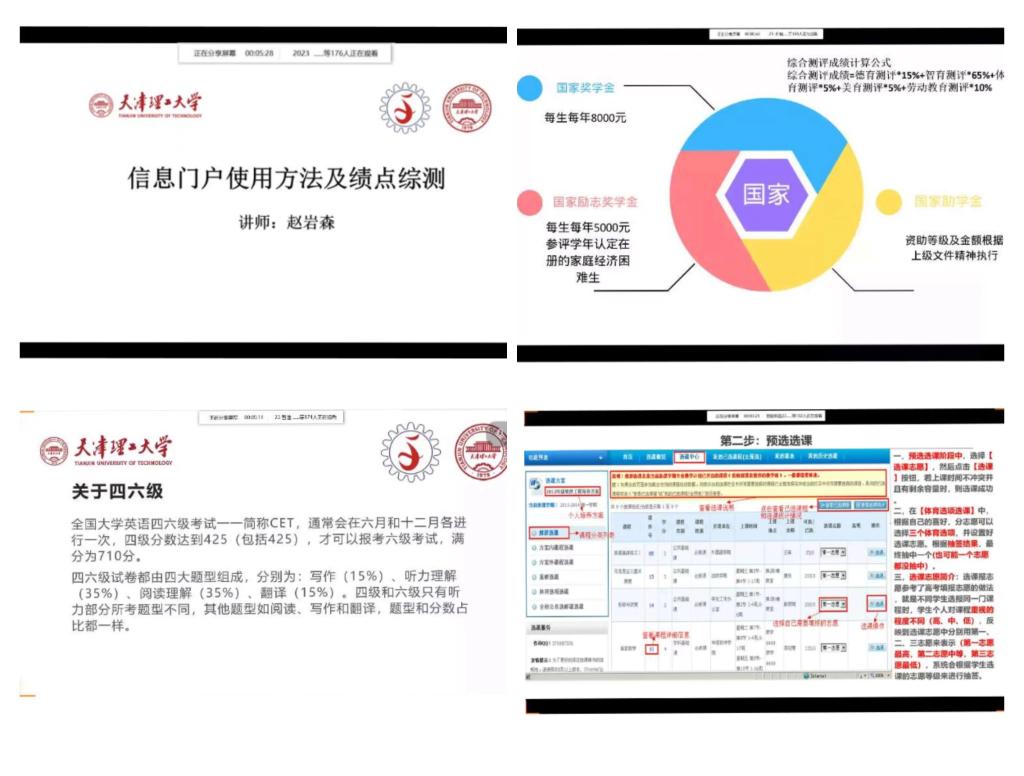 機械工程學院朋輩講師趙巖森為新生們講解如何使用信息門戶,詳細講解了綜合測評相關事項。隨后朋輩講師宋鼎介紹了英語摸底考試以及四六級考試流程,分享了自己的備考建議以及答題技巧。朋輩講師陳君凡為新生們講解了獎學金的種類、申請條件以及評選流程。朋輩講師李碩介紹了圖書館資源使用方法,為大家展示了“線上+線下”圖書館強大資源以及檢索,幫助新生在以后的學習過程中不“迷路”。