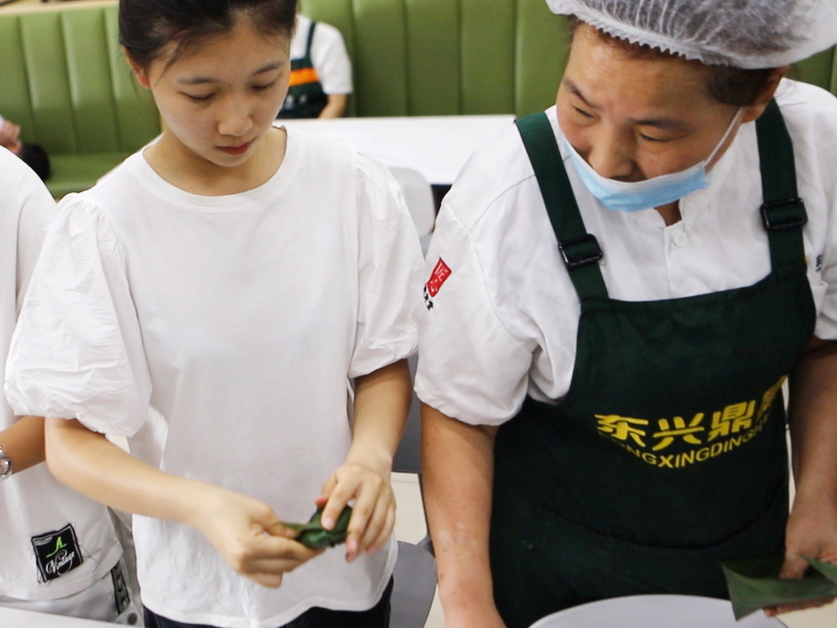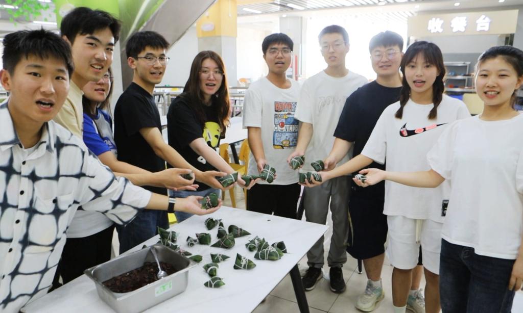 一食堂二層阿姨早早準備好了粽葉、糯米、紅棗、豆餡等食材,師生一起開始包粽子、暢談端午民俗文化。有的同學是技術嫻熟的“高手”,折粽葉、裝糯米、扎繩子,在他們的巧手下,一個個鮮綠的粽子就誕生了;有的同學是現學現賣的“新手”,包粽子時屢屢出現“紕漏”,好不容易裹好了粽葉,糯米又漏出來了。大家互幫、互教、互學,活動現場洋溢著濃濃的節日氣氛。經過幾個小時的忙碌,一盆盆翠綠精致新鮮的粽子已包好,入鍋慢煮,馥香四溢。活動結束后,同學們把煮好的粽子送給平時默默付出的宿管阿姨、食堂工作人員、室友同學們,和他們一起享受節日的“儀式感”。