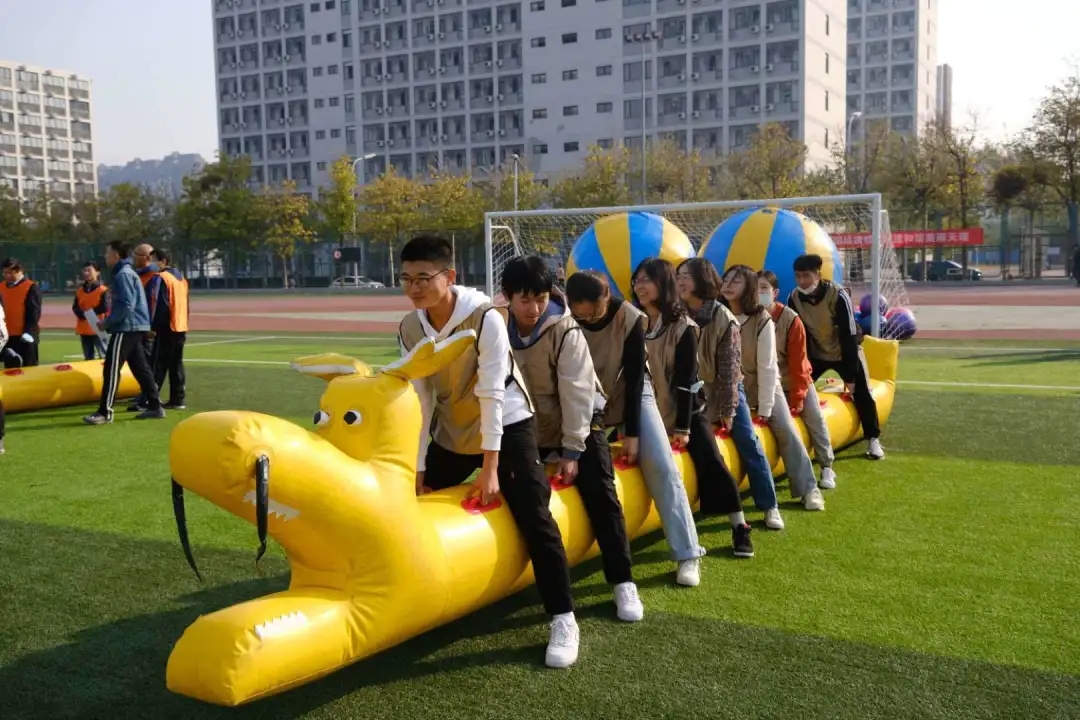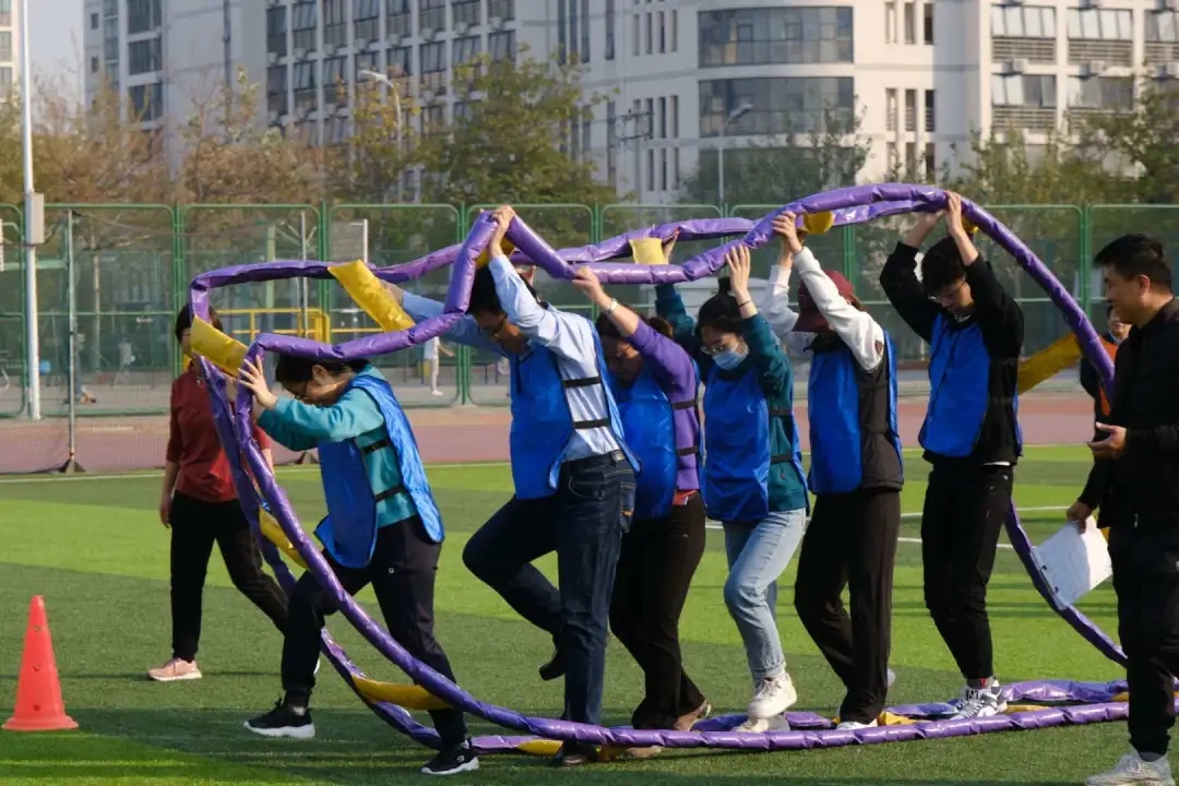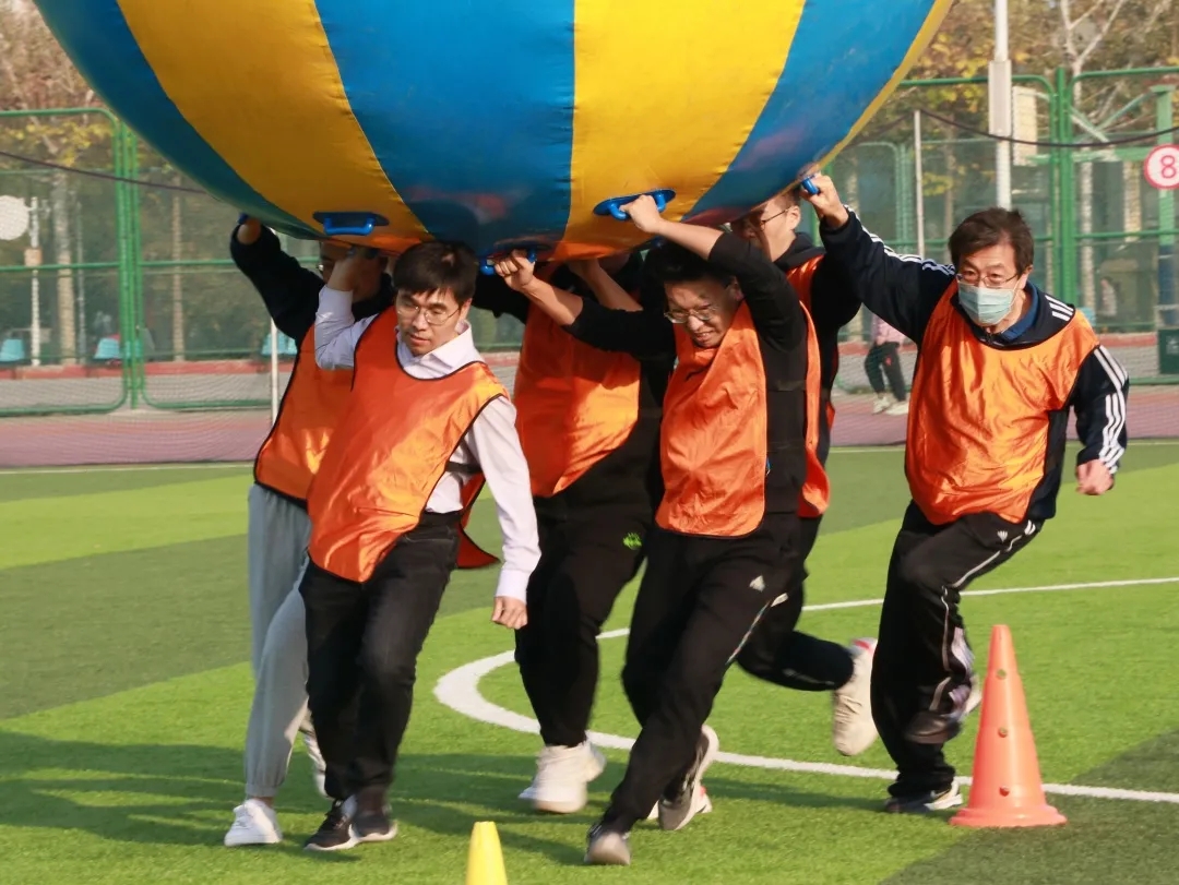 準備活動之后,隨著裁判員一聲令下,趣味運動會火熱進行,豐富、有趣的運動項目讓老師同學們樂翻了天。本次趣味運動會共包括“同舟共渡”“后浪滾滾”“同襄共舉”和“一脈相承”4個項目。參賽的8支隊伍由本科生黨支部、研究生黨支部和教工黨支部共同組建,學院專任教師、行政人員和各專業本科生、研究生代表均踴躍參與。師生并肩攜手合作奮力拼搏,展現了天理管院人齊心協力、攻堅克難、勇往直前的風采。