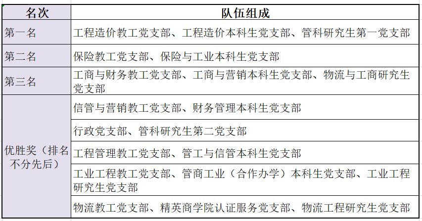 最終,由工程造價教工黨支部,工程造價本科生黨支部和管科研究生第一黨支部組成的第四代表隊,由保險教工黨支部、保險與工業本科生黨支部組成的第三代表隊,由工商與財務教工黨支部、工商與營銷本科生黨支部、物流與工商研究生黨支部組成的第五代表隊分別榮獲師生趣味運動會前三名。
