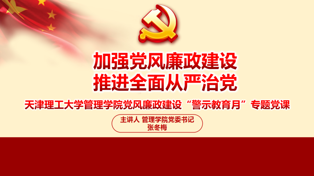 為貫徹落實黨的十九屆四中全會精神和《黨委(黨組)落實全面從嚴治黨主體責任規定》,推動全面從嚴治黨不斷向縱深發展,進一步增強黨員干部和廣大教師廉潔自律意識,筑牢思想防線,根據《關于進一步加強天津理工大學黨風廉政警示教育工作的實施方案》要求,管理學院于10月17日召開黨風廉政建設“警示教育月”主題宣講會,學院全體教師參加。