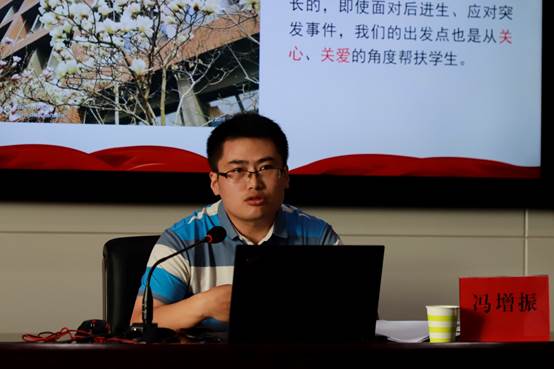 馮增振老師以“新時代思政工作者的責任與擔當”為題,從“怎樣認識責任與擔當”、“新時代賦予思政工作者哪些責任與擔當”和“怎樣認識責任與擔當”三個方面就新時代思政工作者所肩負的崗位職責和使命擔當作了重點解讀。他從“什么是共產黨人的擔當”出發,回顧了歷代共產黨人如何勇于擔當,帶領中華民族完成了國家主權獨立、政權重建、國家統一、人民解放、民族復興等一系列復雜的歷史任務,并以習近平總書記提出的新時代教育改革發展實踐中形成的新理念、新思想、新觀點為指導,從承擔能力素養提升的責任、勇擔培養時代新人的使命、落實校園和諧穩定的任務三個角度著重闡釋了新時代思政工作者的責任與擔當。他提出,思政工作者面對本領恐慌要學思踐悟、知行合一,面對學生培養要立德樹人、以生為本,面對校園危機要敢于亮劍、迎難而上,努力將自身肩負的責任與擔當落到實處。