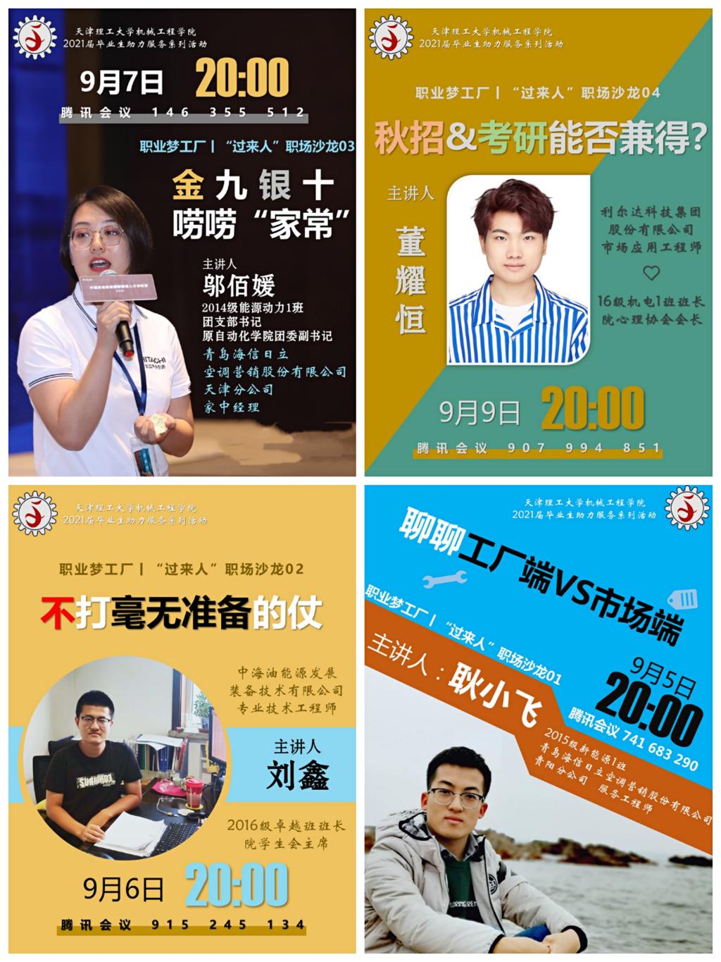 2014級能源動力1班鄔佰媛、2015級新能源1班耿小飛、2016級機電1班董耀恒、2016級機械卓越班劉鑫等學院優秀畢業生受邀作為主講人,為學弟學妹的就業季加油助力?!敖鹁陪y十嘮嘮家常”“聊聊工廠端與市場端”“秋招和考研能否兼得”“不打毫無準備的仗”,主講人以自己的大學生涯、求職過程、職場成長為例,詳細介紹了本專業學生就業形勢、用人單位招聘需求、求職面試禮儀常識等畢業生關心關注的問題。截至目前累計500余人次參與了線上沙龍。
