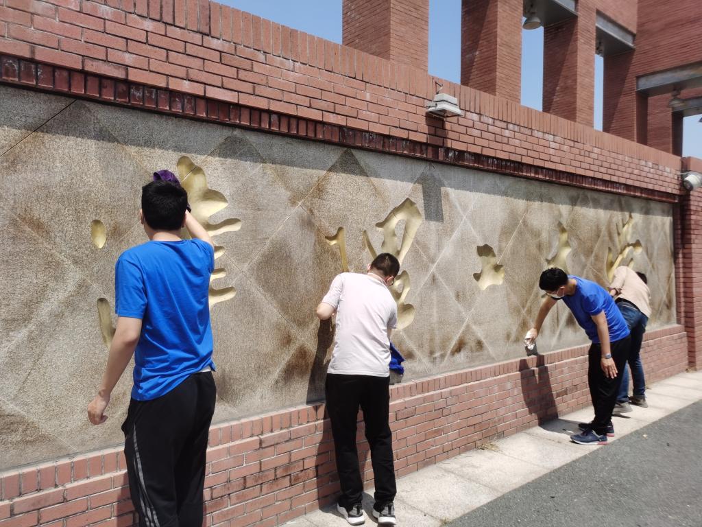 活動伊始,黨支部書記向所有黨員介紹了此次活動的意義,并為同學們講解了學校校訓的含義。隨后各位同志兩人一組,主動承包責任區,用抹布細致擦拭學校南門的校名石碑與校訓石碑,并認真清理了現場的遺留垃圾廢物。在清理過程中,各位同志既體會了勞動的辛苦,更是對校園的清潔工作人員表達了尊重與感謝;與此同時,在勞動過程中也在細細感受校園的美麗,發現體會天理之美。清理過后,30余名支部黨員同志在校訓石碑前進行了集體宣誓,表達了對學校的感恩與感激,同時也立志謹遵校訓“重德重能求實求新”,在天理沃土上茁壯成長,惜時如金,增長本領,磨礪品質,為學校發展貢獻青春力量,為祖國建設添磚加瓦。