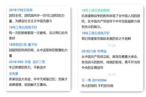 與會同學紛紛表示,經過陳老師的講解后,對中國共產黨的歷史有了更加深入的理解與感悟。中國共產黨九十多年的歷史,是為中華民族的獨立、解放、繁榮,為中國人民的自由、民主、幸福而不懈奮斗的歷史。這九十多年,是中國人民掌握自己的命運、意氣風發地建設新生活的九十多年;是我們黨經受住各種風浪考驗、不斷發展壯大、不斷開創各項事業新局面的九十多年。眾多同學在討論區發表自己的體會和見解。他們表示,黨在風雨歷程中肩負重大使命,在一次次的磨練中取得勝利,成就來之不易,同時也更加堅定自己為中國特色社會主義事業而努力奮斗的決心。