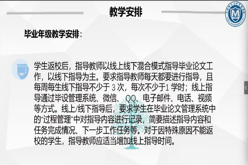 方案要求,各專業(yè)要統(tǒng)籌開展疫情防控和本科教學工作,授課教師因時制宜調(diào)整教學計劃,做好輔導答疑,根據(jù)疫情防控進展合理采用在線教學與線下教學相結(jié)合的方式,保障特殊時期教學工作的連續(xù)性。畢業(yè)班指導教師須密切關(guān)注學生畢業(yè)論文進展情況,采用線上線下混合模式開展論文指導工作。對于特殊原因不能返校的學生,指導教師應(yīng)適當增加線上指導時間,實現(xiàn)“指導形式多樣化、論文質(zhì)量不打折、工作進度不延誤”的工作目標,確保畢業(yè)生按時保質(zhì)完成學業(yè)。